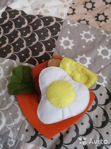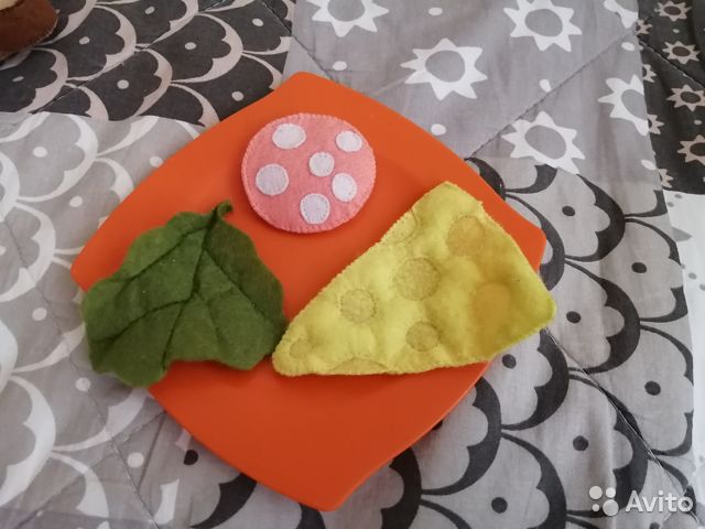 Великолепная возможность для воплощения сюжетно-ролевых игр-это игрушечная еда. Особенно, если еда не из пластика,а из фетра, экологически чистого материала. Фетр приятен на ощупь, мягкий и по текстуре напоминает настоящую еду. Фетровая еда развивает воображение ребенка, речь, аккуратность, математические способности, тактильные ощущения. Ребенок стремится подражать свою маму на кухне, придумывать блюда, создать свой бутерброд, играть ,,в ресторан", угощать друга ,,вкусняшками". Фетровая еда прослужит Вам долго. В наборе "Бутерброд" 4 продукта. Набор для чая 5 пакетиков чая.