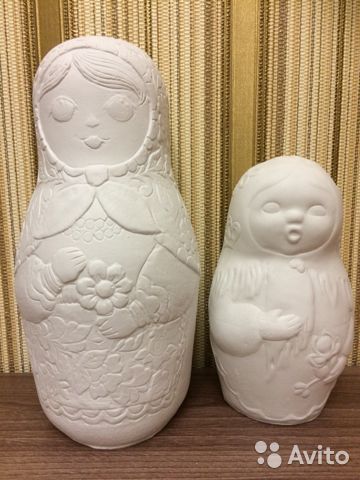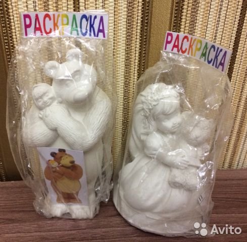 Гипсовые статуэтки-раскраски. Можно расписать акриловыми красками, гуашью или фломастерами. «Маша и Медведь» (300), «Девочка с мишкой» (300), «Матрёшки» (300, 250).